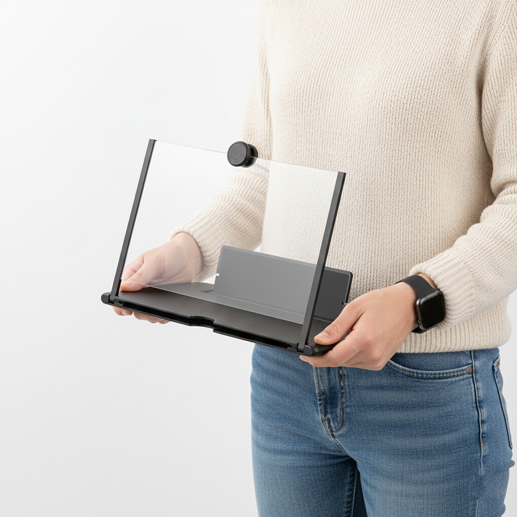 For the best clarity and cinema-like experience, it is highly recommended to use the magnifier in low-light or dark environments. Strong ambient light can cause reflections on the lens.
